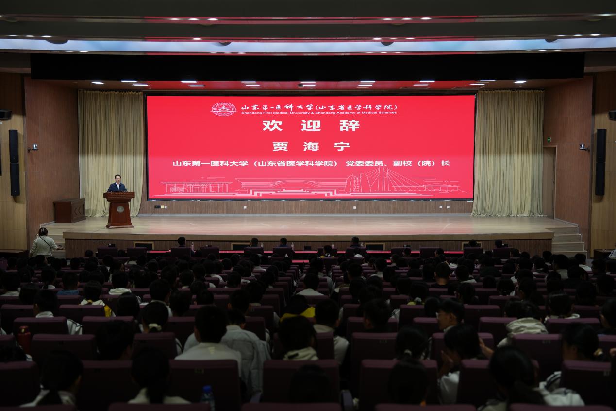 贾海宁围绕“初心”“探索”“成长”三个关键词,向师生们介绍了校(院)百年医脉传承的历史沿革、以9位两院院士为核心的顶尖师资团队,以及80000平米医学科创中心、12家附属医院支撑的办学体系,详细阐述了校(院)在医学教育、科研创新与临床服务等方面取得的显著成绩。他表示,校(院)作为山东省科教融合的医学高地,始终秉持“厚德博学、精益求精”的校训,是同学们探索医学奥秘、实现人生理想的优质平台,鼓励同学们保持对生命的敬畏与好奇,以此次研学为契机点燃医学梦想。