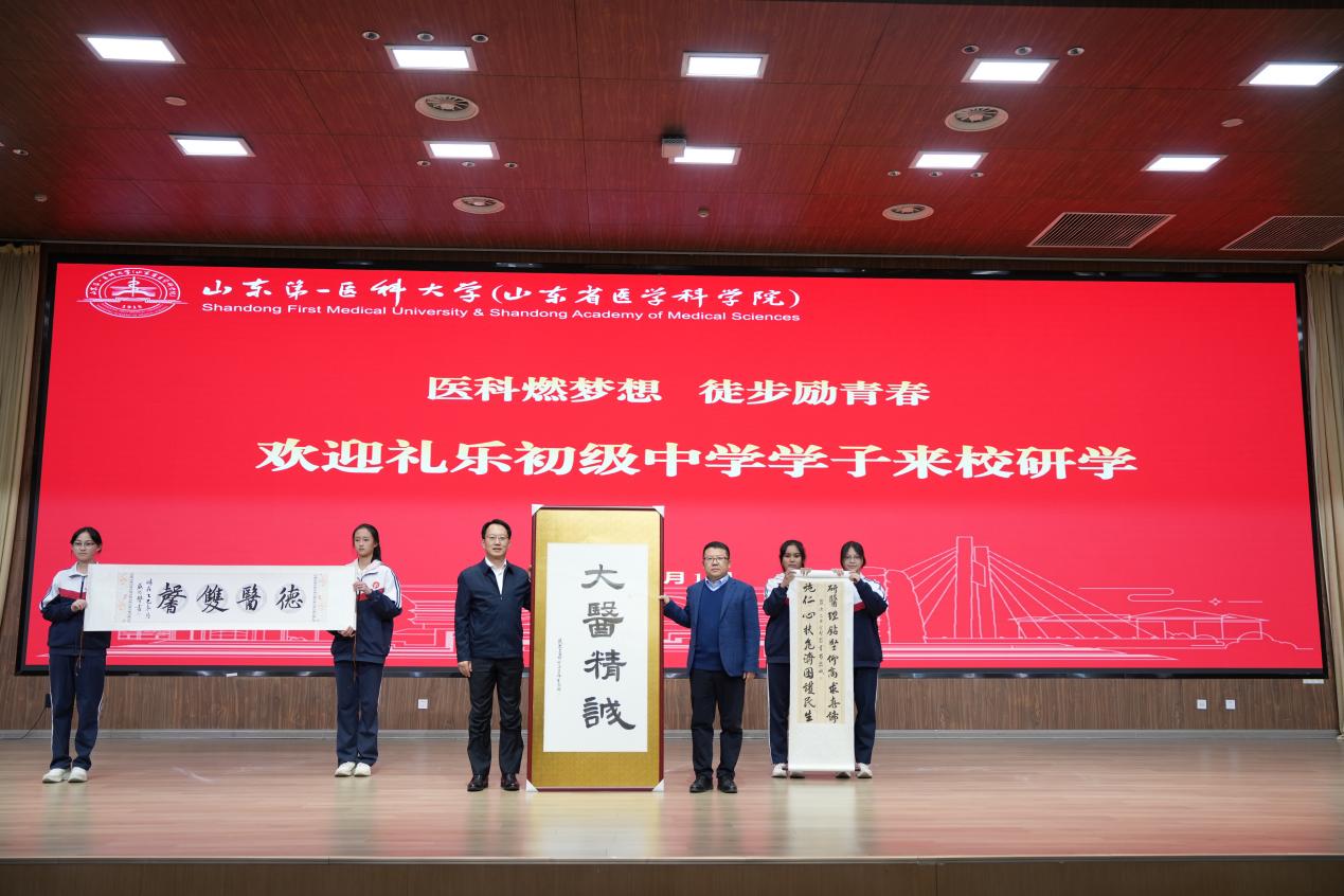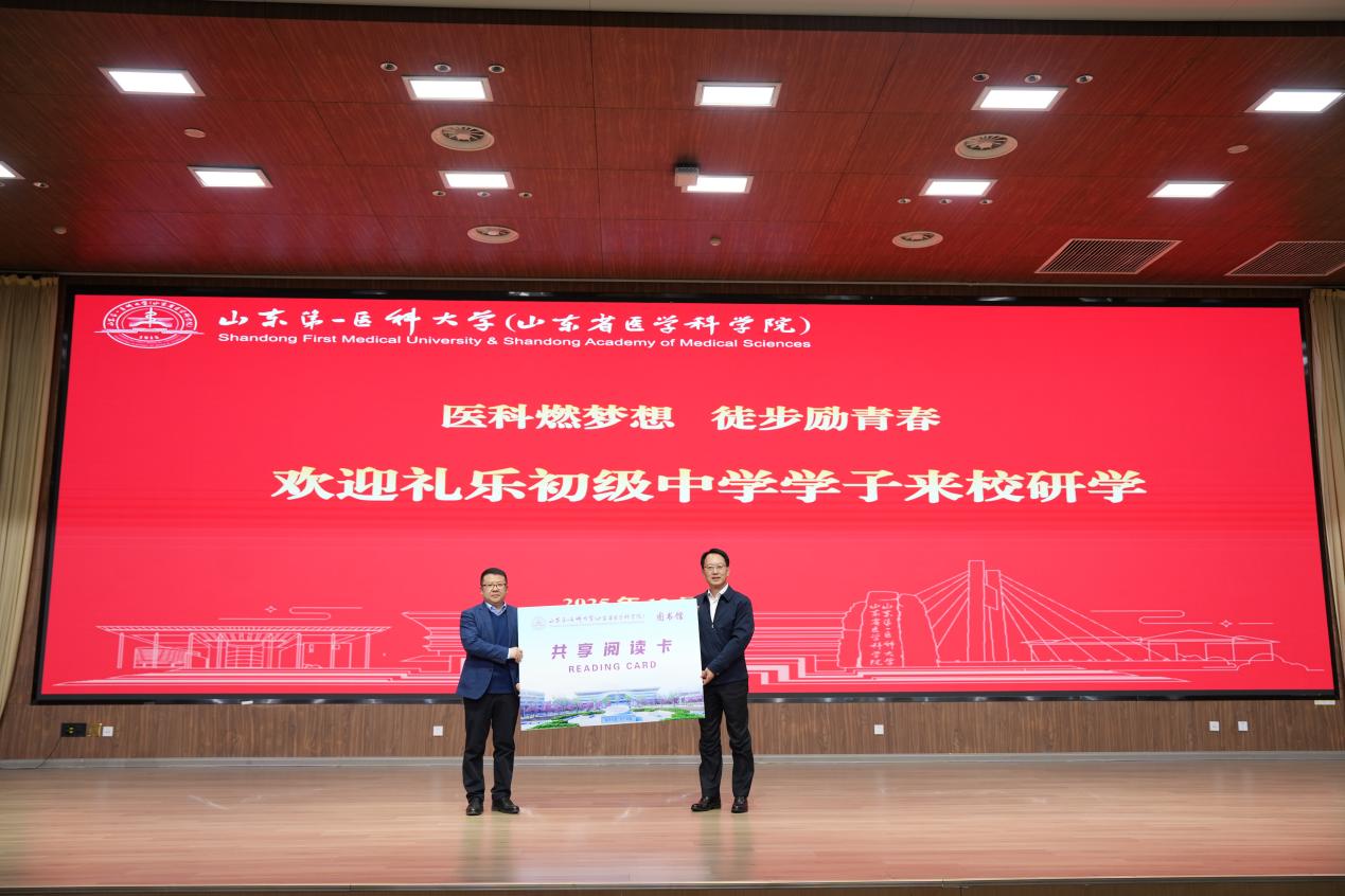 礼乐中学书记、校长马玉金对校(院)精心筹备本次活动表示感谢,高度肯定了校(院)在医学领域的突出成就,并寄语同学们珍惜研学机会,将所学知识转化为守护健康的力量。活动现场,礼乐中学向校(院)赠送师生书写的“大医精诚”等书法作品,校(院)回赠包含20万册精品电子书和50万集真人有声书的共享阅读卡。此外,校(院)附属省立医院胃肠外科商亮主任、2024级生物医学科学专业王泉林同学分别围绕“省医烙印 不负韶华 唯有奋斗致青年医学生之路”“走进山一大”主题做分享,为同学们带来生动的医学科普与成长感悟。